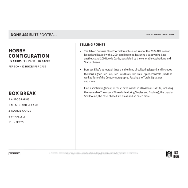 - The fabled Donruss Elite Football franchise returns for the 2024 NFL season locked and loaded with a 200-card base set, featuring a captivating base aesthetic and 100 Rookie Cards, paralleled by the venerable Aspirations and Status chases.