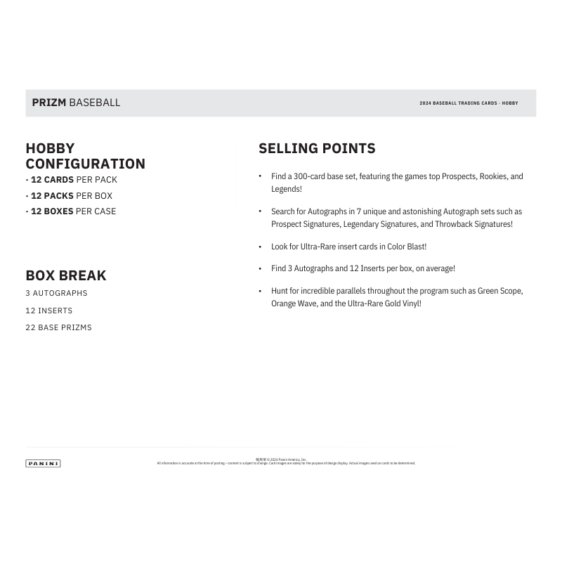 – 2024 Prizm Baseball includes stunning parallels and an incredible 300-card base set, featuring the game’s top Prospects, Rookies, and Legends such as Paul Skenes, Evan Carter, and Willie Mays!