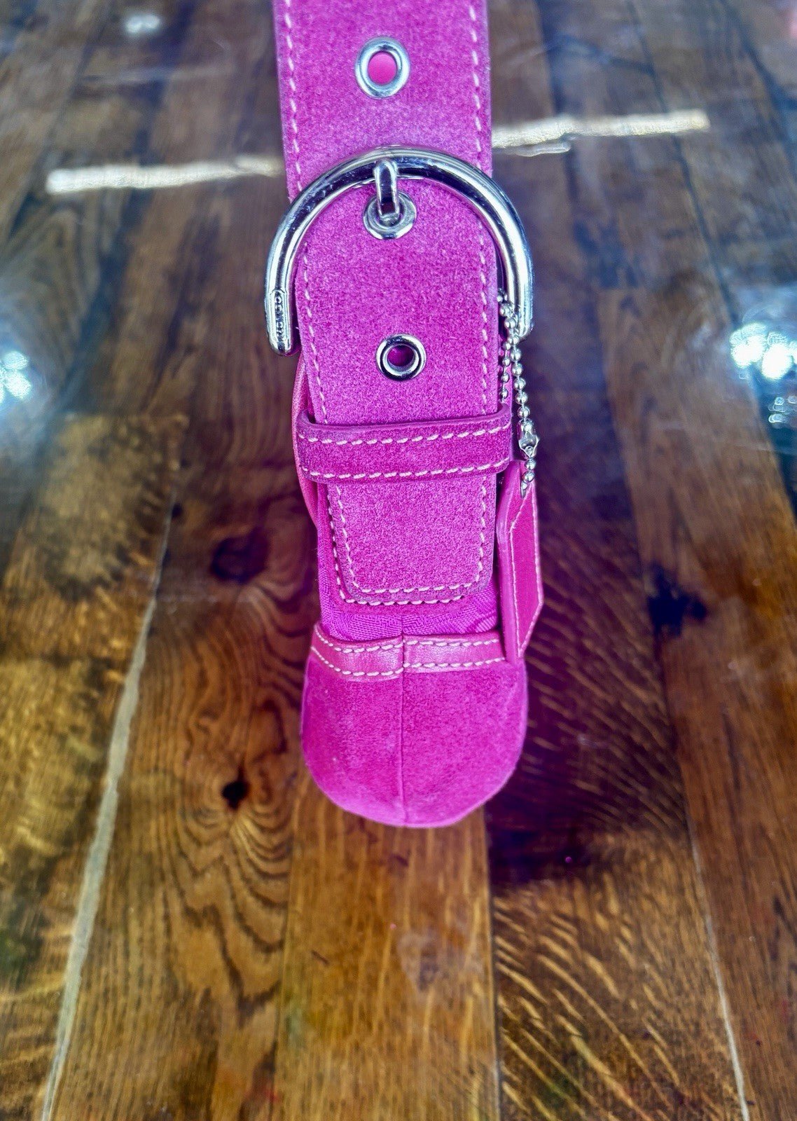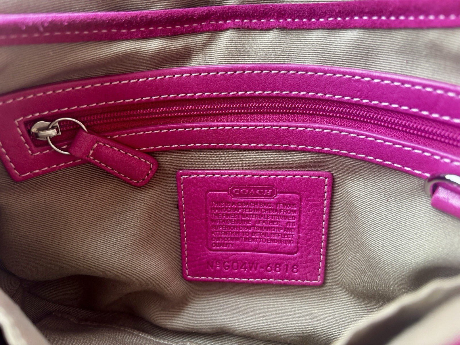 Elevate your accessory collection with the Y2K Vintage Coach 2004’s Soho Signature Shoulder Bag. Crafted from durable canvas material, this mini shoulder bag boasts a chic hot pink exterior, complemented by a sophisticated silver hardware finish. The iconic Coach logo pattern adds a touch of class.